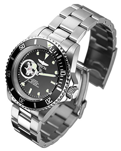 Combining smooth automatic movement with a shining stainless steel design makes this Pro Diver timepiece from Invicta an excellent addition to any man's collection. The soothing black dial and unidirectional bezel with an open-heart feature against the sunray dial gives this watch an intricate and eye-catching appearance that will have heads turning. This website is an authorized reseller of Invicta and each piece comes with the manufacturer warranty.Feature