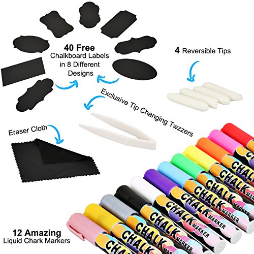 - EASY TO WIPE OFF: With our premium liquid chalk markers you can write on surfaces like glass, mirrors, plastic, ceramics, white boards, vinyl, chalk boards, and other glossy surfaces. All you have to do to clean them afterwards is wipe them with a damp cloth!