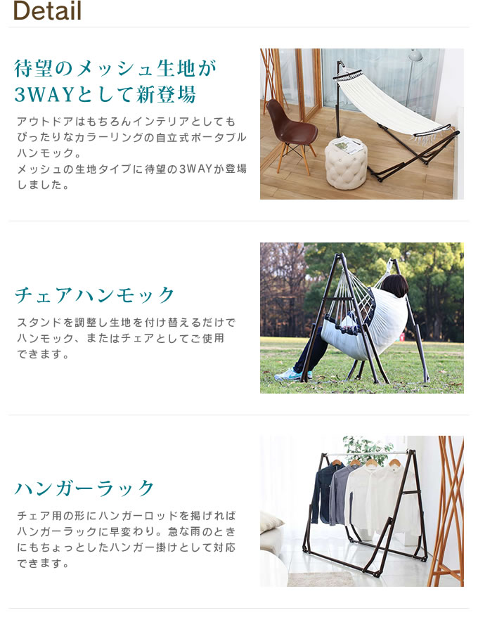 | ポイント | メッシュの優しい生地がふわりと体を包み込み、あなたに至福のひとときをもたらす。 深いブラウンのフレームに優しいメッシュ生地がマッチし、日々の生活に溶け込んでいきます。 フレームのアームを広げるとハンモック、狭めて生地を変えるとチェア、 ハンガーロッドを付け変えればハンガーラックとしてご使用いただける3wayスタイル。 |
