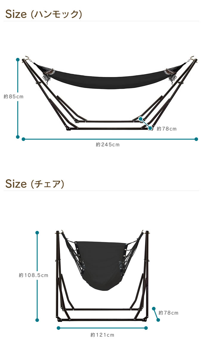 | サイズ | ハンモック時/約幅245×奥行78×高さ85cm チェアー・ハンガー時/約幅121×奥行78×高さ108.5cm 収納バッグ・折りたたみ時/約幅115×奥行17×高さ12.5cm |