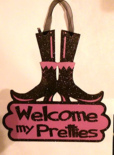-. Feature : Halloween Witch Legs & Boots Sign "Welcome My Pretties" / Purple & Black Glitter Wood Witches Legs & Shoes Sign / Decoration measures 10" X 10" / Put some fun in your Halloween Decor!