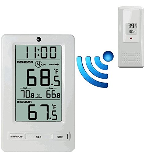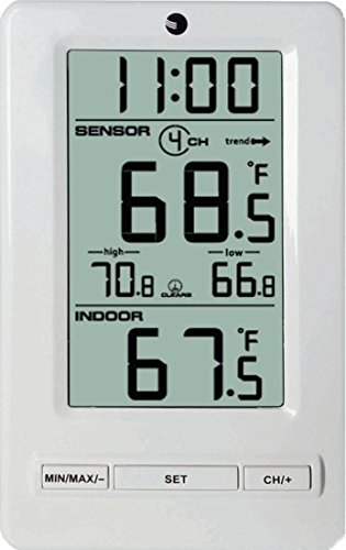 Simple to read, simple to use, and affordable, the WS-0802 includes an indoor thermometer in the console and can remotely read and update up to eight remote sensors from the compact display. The WS-0802 includes one remote, and seven additional sensors can be added (F007T air temperature, F007TP temperature probe and F007PF floating pool thermometer) for comprehensive monitoring. Each remote sensor includes dip switches for 8-channel selection and units of measure (degF vs degC). The sensor search mode allows you to re-sync sensors without removing and re-inserting batteries. Optional calibration is provided for the utmost accuracy. Although calibration is optional and not required, the purpose of calibration is to fine tune or correct for any sensor error associated with the devices margin of error and inevitable sensor drift associated with electronic measurements. The measurement can be adjusted from the console to calibrate to a known source. The display console displays temperature, minimum and maximum temperature, which can be reset manually or daily, date and time. The scroll mode allows you to view the indoor thermometer and remote channels without pressing any buttons. In scroll mode, all of the indoor and detected outdoor sensors will be displayed in five second intervals.Feature