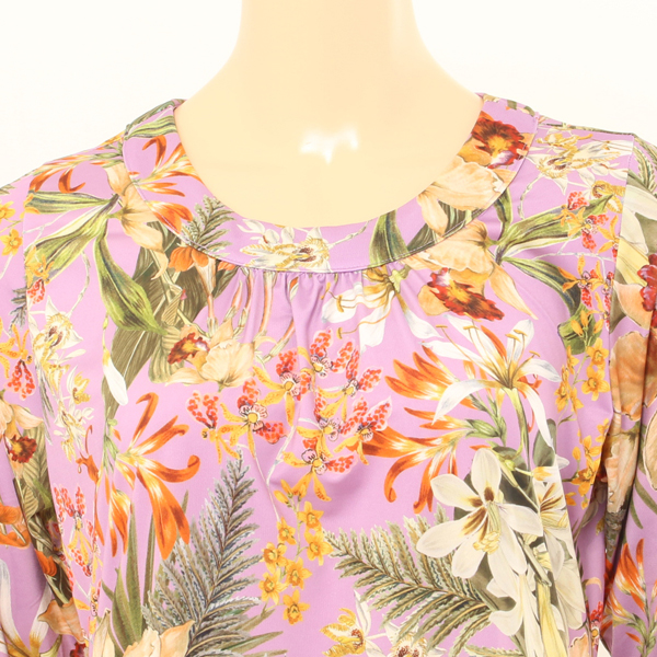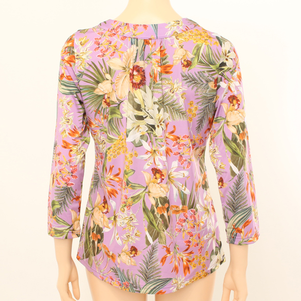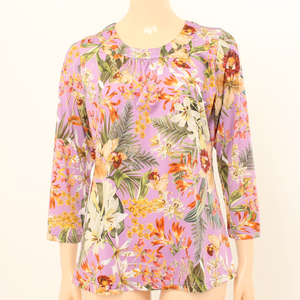 화사한 칼라 및 패턴이 화려한 간절기 여성 이지웨어상의 입니다.