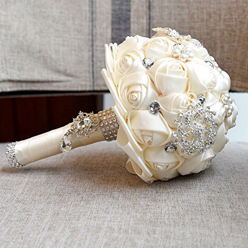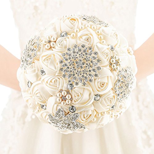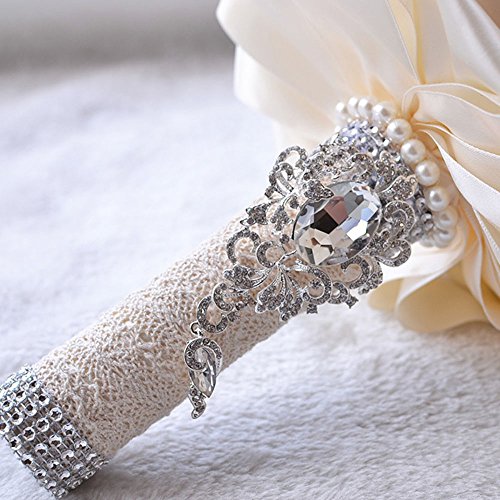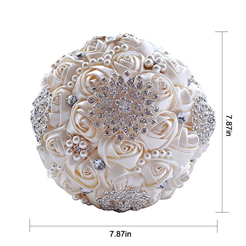Sisjuly Beaded Rhinestone Pearls Holding Bouquet Roses 20cm Diameter for Wedding Bridesmaid Ivory
