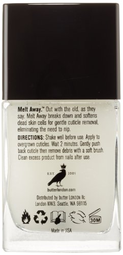 -. Binding : Health and Beauty -. Brand : butter LONDON -. Color : N/A -. Department : womens -. EAN : 0893131002506 -. Feature : Contains no formaldehyde, no toluene, no DBP / Out with the old, as they say melt away breaks down and softens dead skin cells for gentle cuticle removal, eliminating the need to nip / Turns any colour matte, flat, and utterly beautiful / This item is not for sale in Catalina Island -. IsAdultProduct : 0 -. Label : butter LONDON -. LegalDisclaimer : This product can be shipped to any country to which SkinStore currently ships -. Manufacturer : butter LONDON -. Model : 2506-MA -. MPN : BLN-044 -. NumberOfItems : 1 -. PackageQuantity : 1 -. PartNumber : BLN-044 -. ProductGroup : Prestige Beauty -. ProductTypeName : HEALTH_PERSONAL_CARE -. PublicationDate : 2011-04-05 -. Publisher : butter LONDON -. ReleaseDate : 2011-04-11 -. Size : 0.6 fl. oz. -. Studio : butter LONDON -. Title : butter LONDON Melt Away Cuticle Eliminator -. UPC : 885406875359