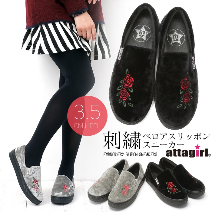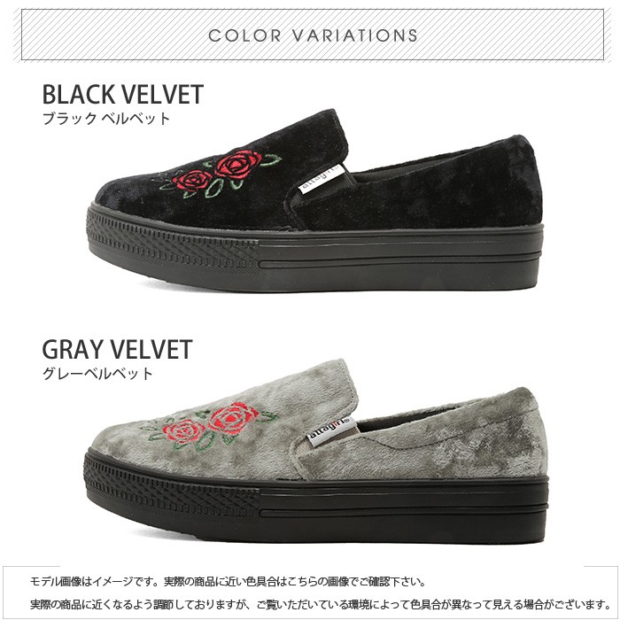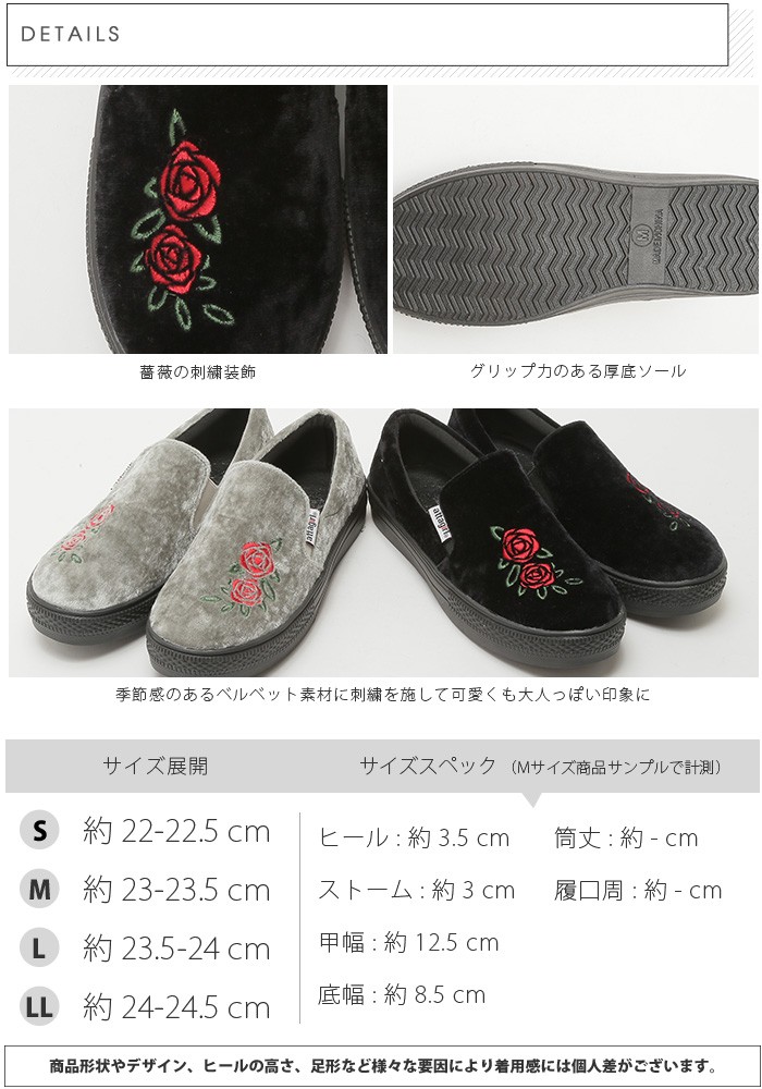 薔薇の刺繍装飾。グリップ力のある厚底ソール。