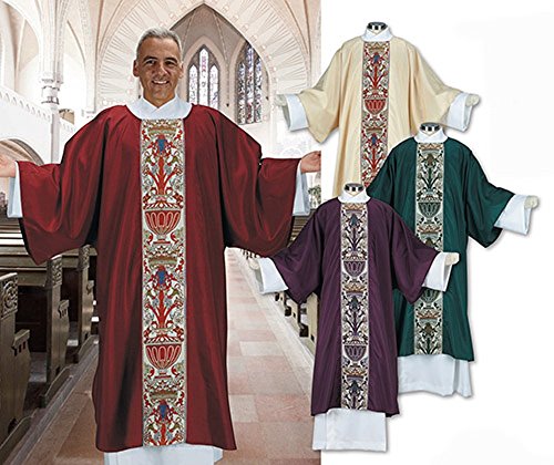 Studio : AT001 Publisher : AT001 Binding : Jewelry Product Description A set of Coronation Dalmatics in four liturgical colors. Exclusive Coronation design Beautifully woven tapestry with custom dyed threads Available in four liturgical colors Dalmatic comes with an inner stole with embroidered cross -- 100% Polyester- 300D*300D/58*53/156gsm, w/ tapesry orphrey: 90% Poly/10% metal 0