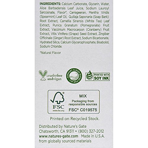 Studio : Natures Gate Publisher : Natures Gate Binding : Misc. Product Description A natural alternative to fluoride toothpaste. For a clean and healthy feeling mouth.Nature's Gate natural herbal toothpaste, when used daily and with proper brushing, helps promote good oral health. Our formulation includes an abundance of Free Calcium (derived from Extracts of Carrots and Calcium Ascorbate), a ntural strengthening component of teeth that helps remove plaque. Our fluoride-free toothpaste also includes Vitamin C and Baking Soda that act as gentle abrasives to help clean and whiten your teeth, naturally.Nature's effective ingredients for healthy tteht and gums are found in Nature's Gate natural toothpaste.Free Calcium, Soluble calcium, an enamel strengthening component. helps protect tooth enamel. Derived from Extract of Carrot and Calcium Ascorbate.Calcium Carbonate (Natural Calcium), a natural mineral, gently cleans teeth and removes food particles.Vegetable Glycerin, maintains toothpaste freshness; acts as a natural humectant; protects and soothes gums.Purified Water, free of spores, impurities and hard minerals, maintains toothpaste freshness.Carrageenan, natural sea kelp gel, gives toothpaste a smooth, rich feel and protects sensitive gums from irritations.Sodium Bicarbonate (Baking Soda), neutralizes bacterial acids that damage tooth enamel; helps fight tooth plaque.Sodium Lauryl Sulfate, a mild foaming cleanser derived from coconut oil, helps clean hard-to-reach areas; keeps mouth feeling fresh.Natural Mint Flavor, pure Mint Oil, lends a pleasant taste that encourages tooth brushing, even among children.Calcium Glycerophosphate (Natural Mineral), helps strengthen tooth enamel by reinforcing calcium bioavailability. Maintains proper pH balance by reducing excess acid.Carrot Root Extract, naturally rich in vitamins and minerals.Calcium Ascorbate (Vitamin C), helps maintains healthy gums.Sea Salt, maintains toothpaste freshness, pH balance and helps stimulate gums.We hope you've come to think of Nature's Gate ... 0
