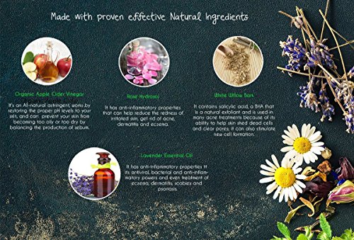 It's an All-natural astringent, works by restoring the proper pH levels to your skin, and can prevent your skin from becoming too oily or too dry by balancing the production of sebum. It contains powerful alpha hydroxy acids to help remove dead skin cells and reveal a fresher and healthier complexion. It also features Rose Water and Willow Bark for its anti-bacterial, astringent, purifying properties. And Lavender oil for it's soothing effect on the skin. Applications: Shake and Apply on your dry spots to prevent breakouts and minimize blemishes. Combined with an exclusive blend of botanical extracts known to be high in anti-microbial and anti-inflammatory compounds, with pore cleansing and antiseptic properties to help control and heal acne breakouts. It's a power punch quality ingredients !!