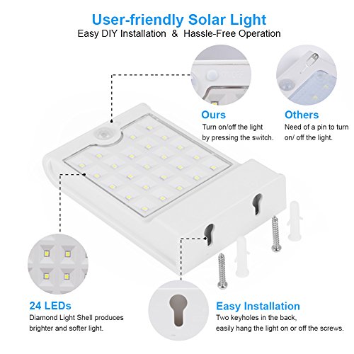 Updated Solar LED light: Bigger solar panel & Super bright 24 LED provide more powerful illumination for a wider outdoor area.