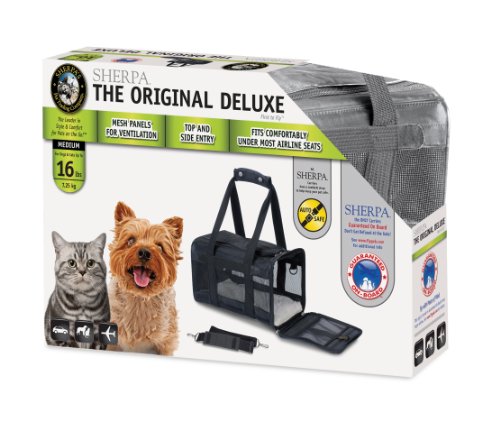 Studio : Quaker Pet Group Publisher : Quaker Pet Group Binding : Misc. Product Description Travel in comfort and design with the Sherpa Original Deluxe pet carrier. The Original Deluxe is perfect for traveling by plane or car, for a trip, or just to the vet. Featuring top and side entry, a dual seatbelt / luggage strap, locking zippers, mesh panels for ventilation, rear storage pocket and faux lambskin liner, this carrier has everything you and your pet need for a comfortable, safe trip. The Original Deluxe is approved for use on most major airlines and included in Sherpa's Guaranteed On Board program. This carrier is intended for dogs and cats up to 16 pounds and is 17 inches long, 10.5 inches high and 11 inches wide. The faux lambskin liner is machine washable and the carrier is to be spot cleaned only. All Sherpa carriers are protected by a one year limited warranty against manufacturer defects. 0