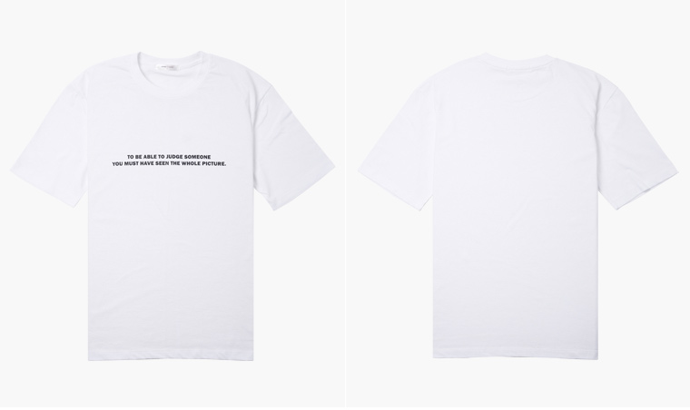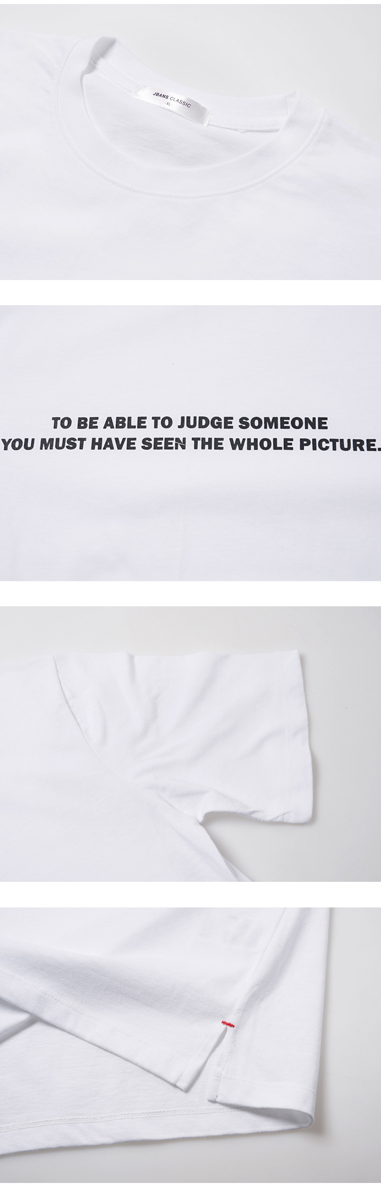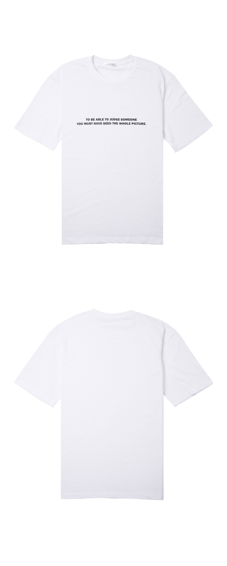 한번쯤 생각해보면 좋을 내용의 프린트가 은은하게 자리잡아 깔끔한 티셔츠로 완성되었습니다.