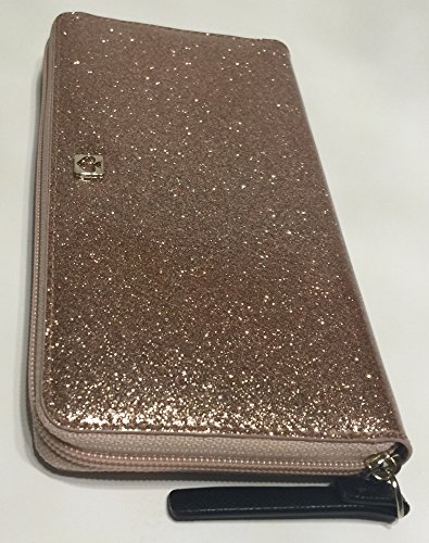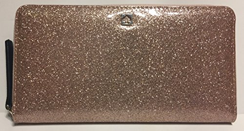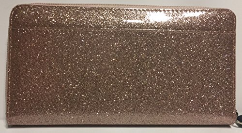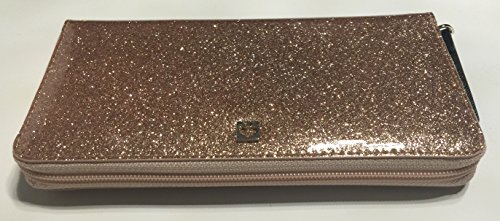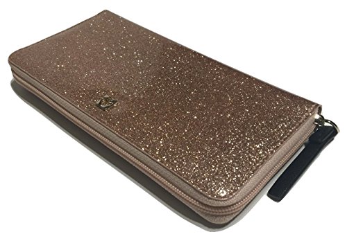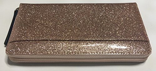- Glittery blue patent leather - Navy blue leather on the inside - Zip around closure - Zipper pouch - (L) 7.5 x (H) 4 x (W) 1 inches
