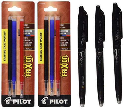 Deal includes: 3 each Pilot 31550 FriXion Ball 0.7mm Erasable Black Gel Ink Pens, plus 2 packs of black erasable gel ink refills with 3 refills per pack. FriXion ball pens have a unique Thermo-Sensitive Gel Ink Formula that disappears with erasing friction. Rewritable-erase and rewrite repeatedly without damaging documents - No wear or tear! Fine point 0.7mm. Writes smooth, erases clean.