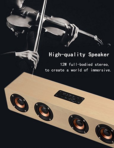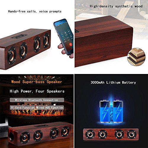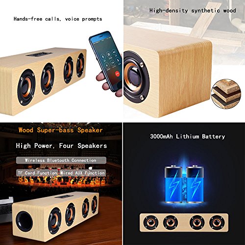 -. Feature : STEREO NATURAL SOUND.Bluetooth chip, clear sound and perfect quality, powerful bass and can enjoy unfettered stereo music anytime, anywhere when you are out. 12W (3wx4) Powerful makes the sound more vigorous and powerful bass surging. / ELEGANT WOODED CUBE DESIGN.Wooden case, elegant cube design, perfect for PC phone home and outdoor.Support external 3.5mm audio input and TF card function. / 3000 mAh HIGH CAPACITY BATTERY.Large-capacity battery to ensure longer music time.Energy saving, Eco-friendly,No Radiation.Charging 4 hours, playing for 12-20 hours. / Bluetooth 4.2. Outdoor bluetooth Speaker,built-in bluetooth 4.2 wireless transmission, working distance up to 10 meters.Built-in high-definition microphone, the music automatically pauses when the call is coming, press the call button enter speakerphone mode, then start talking. / ALL COMPATIBLE.Compatible with all bluetooth devices such as smart phones, tablet PC, iPOD ...