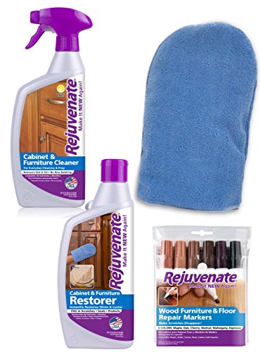 -. Binding : Kitchen -. Brand : Rejuvenate -. EAN : 0678408053470 -. Feature : The Cabinet and Furniture Cleaner removes years of oil, grease and dirt from your cabinets and furniture on finished wood, Formica and laminate surfaces / The polymer based Cabinet and Furniture Restorer has an easy wipe-on application lasts for months, restoring shine and brilliance to finished wood, Formica and laminate surfaces / Wood Repair Markers can easily be applied to the damaged area with exact color matching or gradually blend light colors with dark colors to achieve your perfect color / Microfiber bonnets convert any sponge mop into a microfiber powerhouse and is machine washable and reusable -. IsAutographed : 0 -. MPN : RJCABINETKIT FR -. PartNumber : RJCABINETKIT FR -. ProductGroup : Home -. ProductTypeName : HOME -. Title : Rejuvenate Cabinet & Furniture Cleaner and Restoration Kit For Small Jobs – Includes Microfiber Mitt Applicator and Wood Furniture Repair Markers - 9 Piece Kit -. UPC : 678408053470