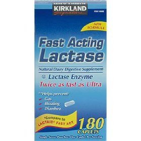 -. Binding : Health and Beauty -. Brand : Kirkland Signature -. Feature : Compare Kirkland SignatureTM Ultra Lactase to the Active Ingredient in Lactaid Ultra - Save money / Helps you enjoy dairy foods without gas, cramps, bloating or diarrhea. / Great value = 180 caplets / PREVENT symp associated with Lactose Intolerance / TWICE AS FAST as Ultra strength products previously available -. IsAdultProduct : 0 -. Label : Kirkland Signature -. Manufacturer : Kirkland Signature -. PackageQuantity : 1 -. ProductGroup : Health and Beauty -. ProductTypeName : HEALTH_PERSONAL_CARE -. Publisher : Kirkland Signature -. Studio : Kirkland Signature -. Title : Kirkland Signature Fast Acting Lactase, Compare to Lactaid Fast Act (2 Pack)