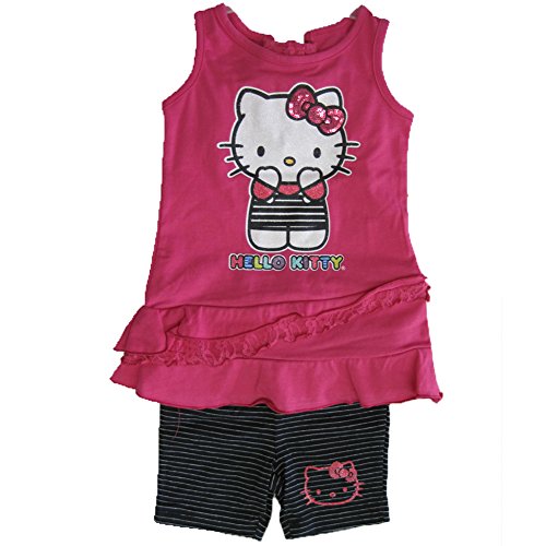 Simply adorable, perfect 2 piece shorts set for your little girl due to its cute applique from Hello Kitty! Cozy, soft outfit includes a tank top with skirted hem and lace adornment, cute glittery Kitty applique. The matching black white thin striped shorts complete the set.Feature
