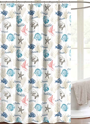 Ocean Life Fabric Shower Curtain: Microfiber Embossed Fish Theme, Colorful Teal, Blue, Coral, Grey, White, 70" x 72" Inches