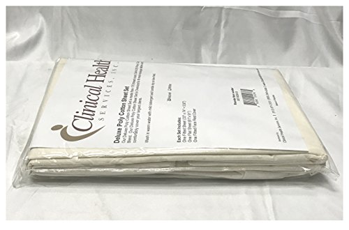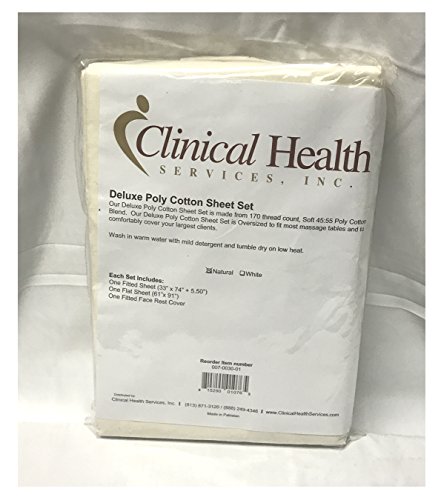 Studio : Clinical Health Services, Inc. Publisher : Clinical Health Services, Inc. Binding : Health and Beauty Product Description Our Deluxe Poly Cotton Sheet Set is made from 170 thread count, Soft 45:55 Poly Cotton Blend. Our Deluxe Poly Cotton Sheet Set is made to fit most massage tables and to comfortably cover your largest clients. Color = Natural. Each Set Includes: One Fitted Sheet (33" x 74" 5.50") One Flat Sheet (61"x 91") One Fitted Face Rest Cover Wash in warm water with mild detergent and tumble dry on low heat. 0
