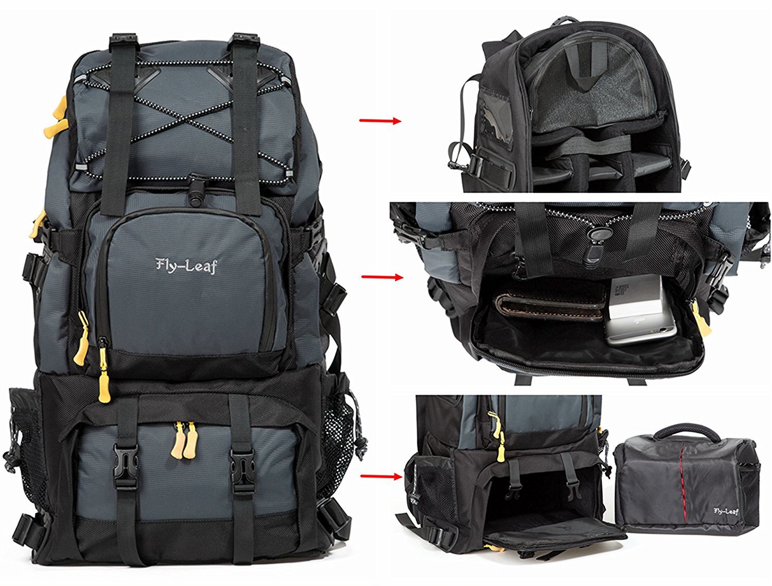 The main storage can store camera equipment at the top and other items at the bottom
