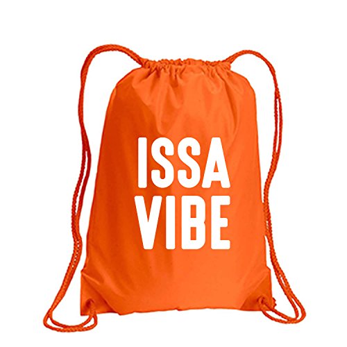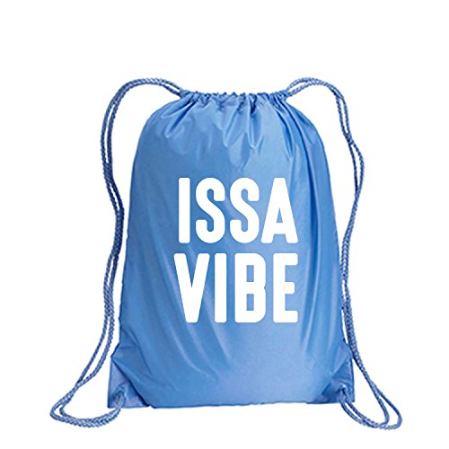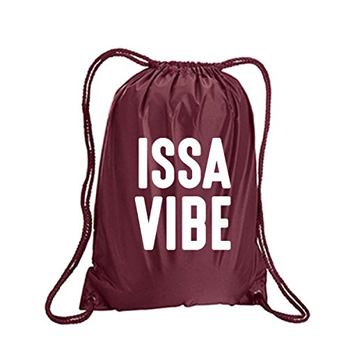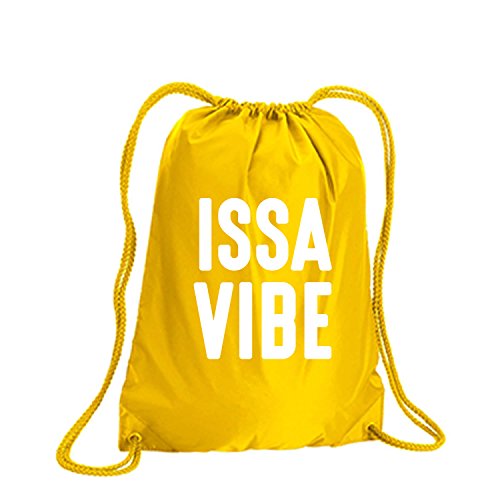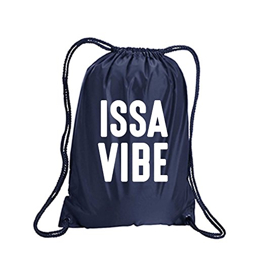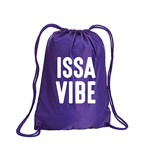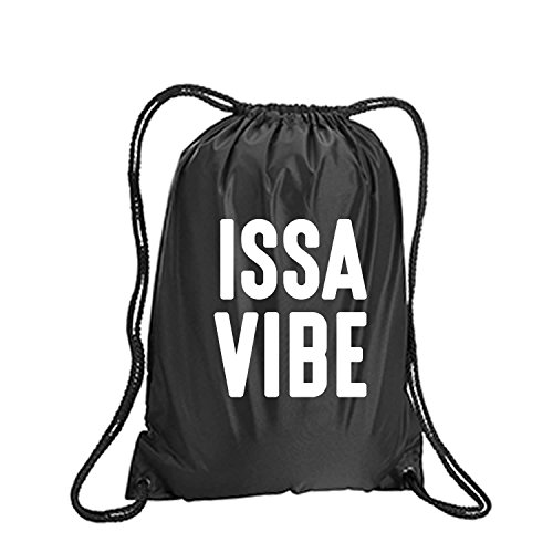 Product Description This durable and stylish nylon tote features "ISSA VIBE" on a cinch pack tote with white ink. Bag comes in small and large sizes and is made of a durable 210 Denier nylon and has color-matched draw cords. Printed in the USA on an imported bag. 0