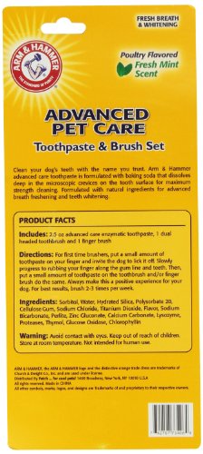 Cleans and deodorizes with the power of baking soda. The Arm & Hammer name has been trusted for over 100 years for gentle yet effective cleaning. Arm & Hammer dental products for dogs safely clean and maintain healthy teeth! Product Detail: Includes: 2.5oz Toothpaste, 1 Dual Headed Toothbrush and 1 Finger Toothbrush Directions: For first time brushers, put a small amount of toothpaste on your finger and invited the dog to lick it off. Slowly progress to rubbing your finger along the gum line and teeth. Then, put a small amount of toothpaste on the toothbrush and/or finger brush and do the same. Always make this a positive experience for your dog. For best results, brush 2-3 times per week. Ingredients: Toothpaste: Sorbitol, Water, Hydrated Silica, Polysorbate 20, Cellulose gum, Sodium Chloride, Titanium Dioxide, Flavor, Sodium Bicarbonate, Perlite, Zinc Gluconate, Calcium Carbonate, Lysozyme, Proteases, Thymol, Glucose Oxidase, Chlorophyllin Warning: Avoid Contact with eyes. Keep out of reach of children. Store at room temperature. Not intended for human use.Feature