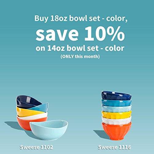 Sweese 1102 Porcelain Bowls - 18 Ounce for Cereal, Salad, Dessert - Set of 6, Assorted Colors