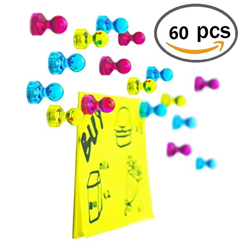 DESCRIPTION: - 60-pack handy magnetic push pins - Designed to use at school, office, home, college and company - One magnet can holds up about 11sheets of paper SPECIFICATIONS: - Colors: red Clear, green, blue, yellow, pink, orange and purple - Weight of the Set: 6.3 ounces - Material: Neodymium magnets and durable translucent acrylic In accordance with Amazon strong magnet policy, these magnets are not strong magnets because the exposed portion of these magnets all have a north polarity, which allows the magnets to adhere strongly to metal but have a weak connection to each other (flux between magnets is less than 50 kG2mm2). KEEP AWAY FROM ALL CHILDREN. Do not put in mouth or nose, this product contains small magnets, swallowed magnets can stick together across intestines causing serious infections and death. Seek immediate medical attention if magnets are swallowed or inhaled.
