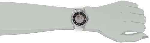 - Feature : Polished stainless steel round shaped case with Swarovski crystal studded bezel / Protective Krysterna crystal on front and decorated case back / Black outer dial with rose tone Arabic numerals and 8 genuine diamond markers with silver shimmering sand finish inner dial / White satin covered genuine leather strap with stainless steel tang buckle / Water resistant to 165 feet (50 M): suitable for swimming and showering