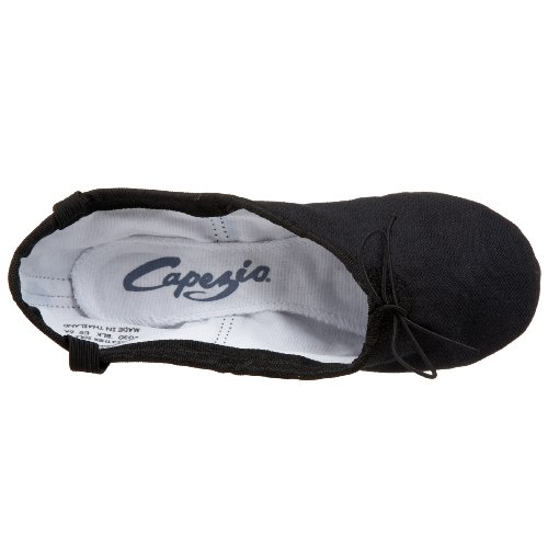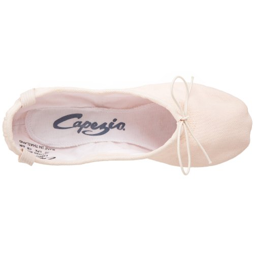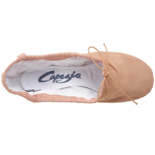 Amazon.com Product Description This delicate ballet shoe from Capezio is a must-have for your practice sessions. The lightweight shoe is made from soft brushed canvas and features a split suede sole for ultimate flexibility. Pre-attached elastic straps offer a custom fit to this low profile shoe.