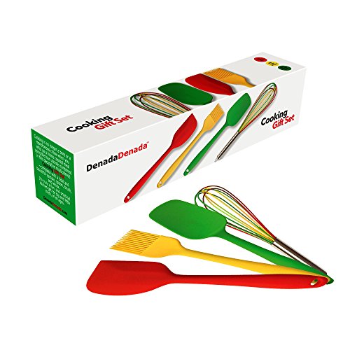 -. Feature : DenadaDenada Cooking Utensils Gift Set - 4 Silicone Kitchen Tools - Red Spatula, Green Spoon, Yellow Brush, Multicolored Whisk