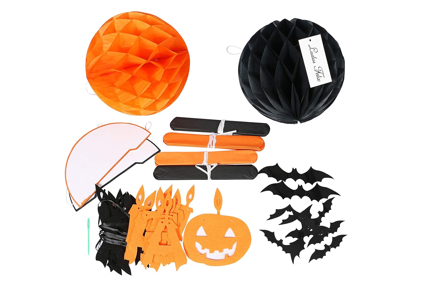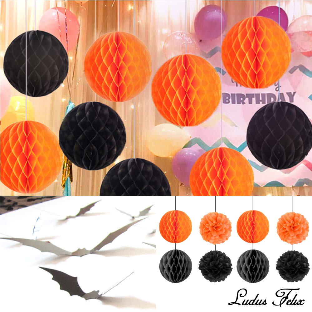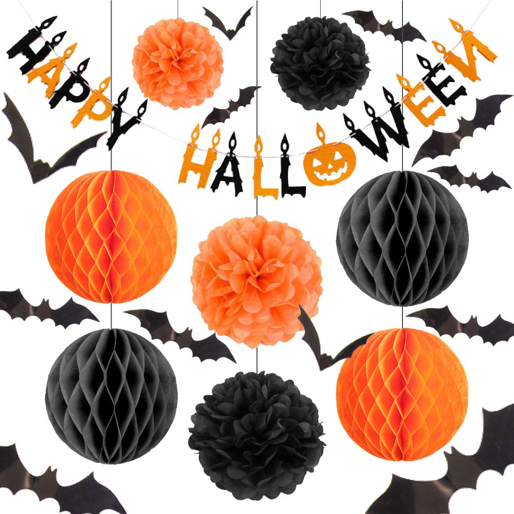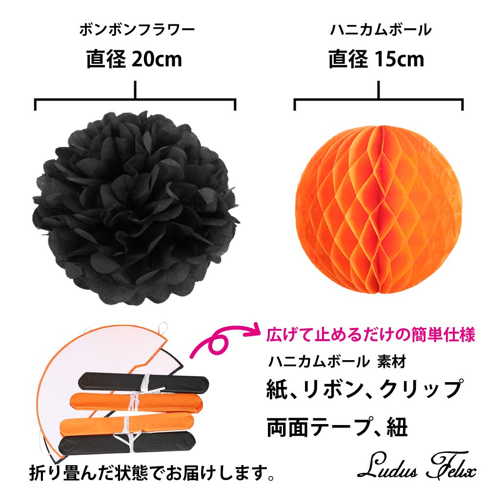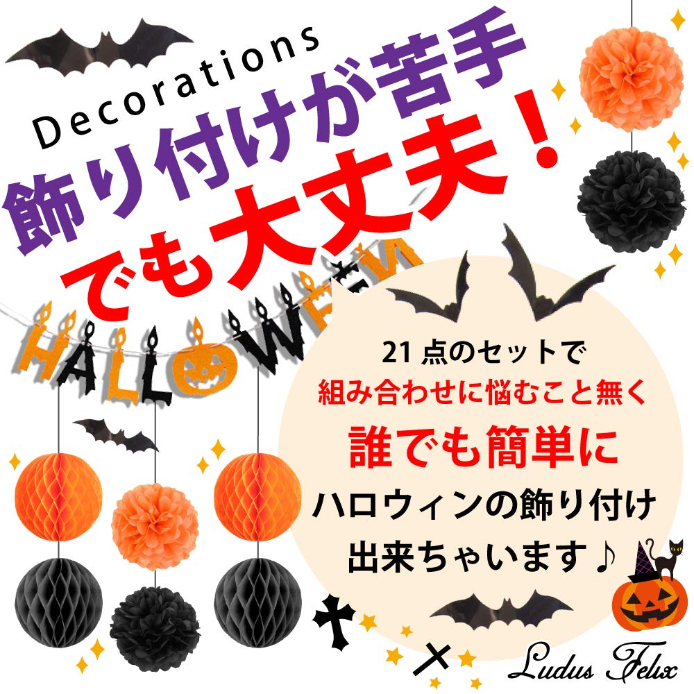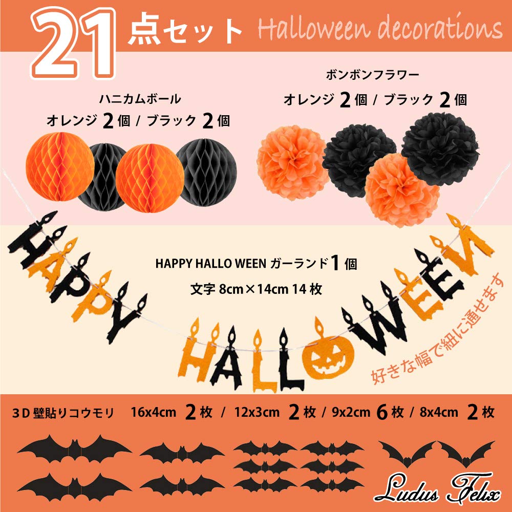 ✅【◎こだわりの21点商品詳細◎】【ボンボンフラワー】直径20cm 4個【ハニカムボール】直径15cm 4個 素材:紙、リボン、クリップ、両面テープ、紐 折り畳んだ状態でお届けします。【HAPPY HALLO WEENガーランド】文字8cm×14cm 14枚 黒紐200cm 1本 紐通し 1本【3D壁貼りコウモリ】16x4cm 2枚;12x3cm 2枚;9x2cm 6枚;8x4cm 2枚 素材:PVC。両面テープが付き。壁にすぐ貼り付けられます。