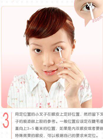 2)眯眼约5到10秒种后,胶液开始凝固。用附带的托叉在紧挨胶液的下面轻轻按后取下。则可形成自然线条。此时,为了更好固定已经形成的线条,眼睛尽可能睁大一些,保持5~10秒不眨眼,则可帮助胶液成就最完美的线条;
