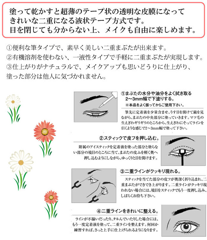 使用玛丽佳人多用美目胶系列产品,可令你眼部更生动,美丽,在短时间内即可达到"双眼皮"的效果,且无任何痛楚,自然而柔美.