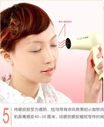 2)眯眼约5到10秒种后,胶液开始凝固。用附带的托叉在紧挨胶液的下面轻轻按后取下。则可形成自然线条。此时,为了更好固定已经形成的线条,眼睛尽可能睁大一些,保持5~10秒不眨眼,则可帮助胶液成就最完美的线条。