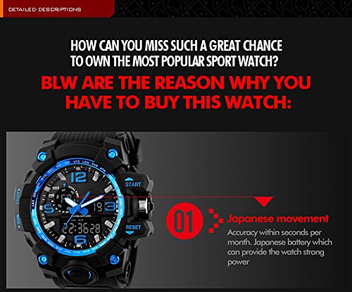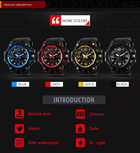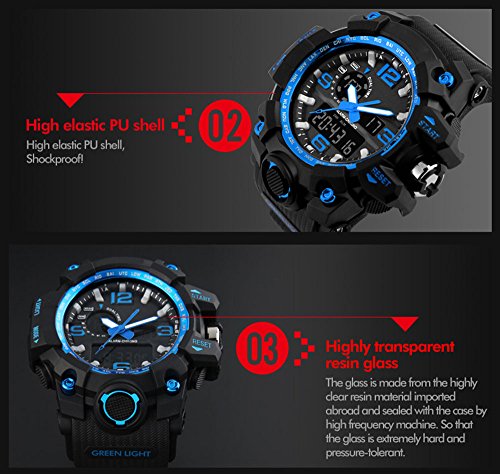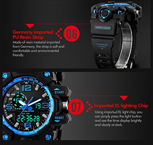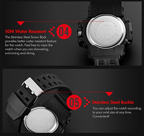 -. Feature : 164FT waterproof: 164 FT (50 M) waterproof - 5ATM water resistant. NOTE: DO NOT press any button under water. / Dual dial two timezone: analog and digital dual dial are designed to support two different timezones. Original Japanese quartz movement used to provide precise and accurate time keeping. / Durable: It is made of shock resistant material and uses long-last battery. Button, buckle and rear cover are all made of stainless steel. Highly transparent resin window makes the watch pressure-proof. / COMFORT with FASHION: silicon rubber watch band with the large dual dial design make it comfortable to wear and lead you to edge sport fashion. / MULTI-FUNCTIONAL: Dual Timezone, Calendar Day and Date, Alarm, Water Resistant, LED Display, Back Light, Shock Resistant, Stop Watch.