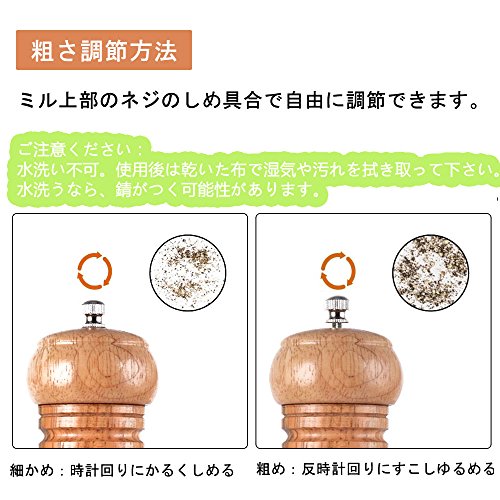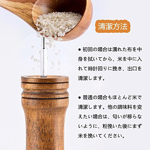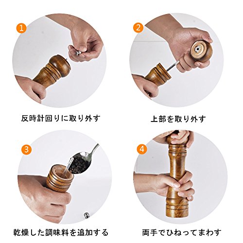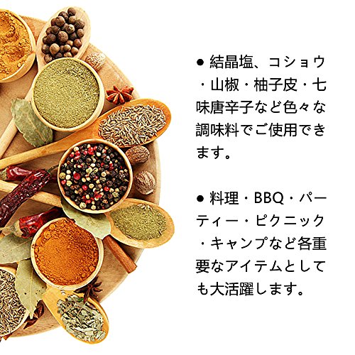 - 結晶塩、胡椒、コショウ、スパイスなどのよく細かくて乾燥したものを使用できます。好みや料理に合わせて、粗さを調節できる。