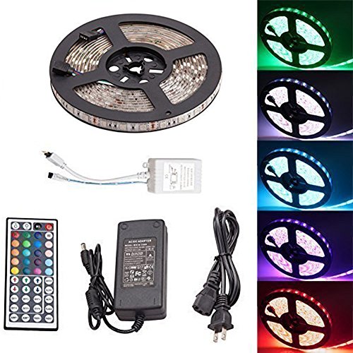 - • Package includes: 5 Meter 5050 RGB 300LEDs Waterproof LED Strip; 1 x 44 Key Remote Control; 1 x IR Control Box; 1 x 5A Power Supply