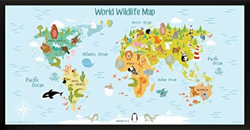 This 12 by 24 inch print features a Wildlife World Map for kids.