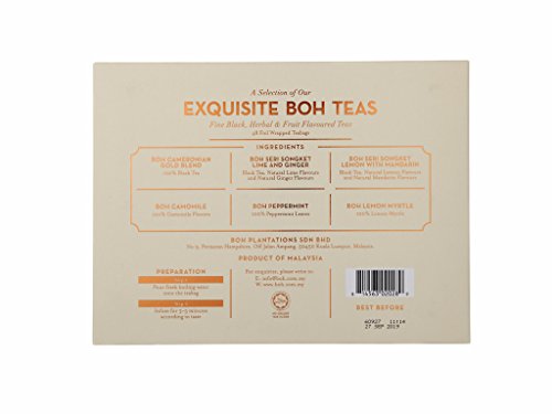CONTENTS & SERVING : Gift pack - 6 flavours of tea (8 teabags each) - Cameronian Gold Blend, Seri Songket Lemon Mandarin, Lime Ginger, Camomile, Peppermint & Lemon Myrtle Flavors. Each tea bag is 1 time use and is easy to use and clean