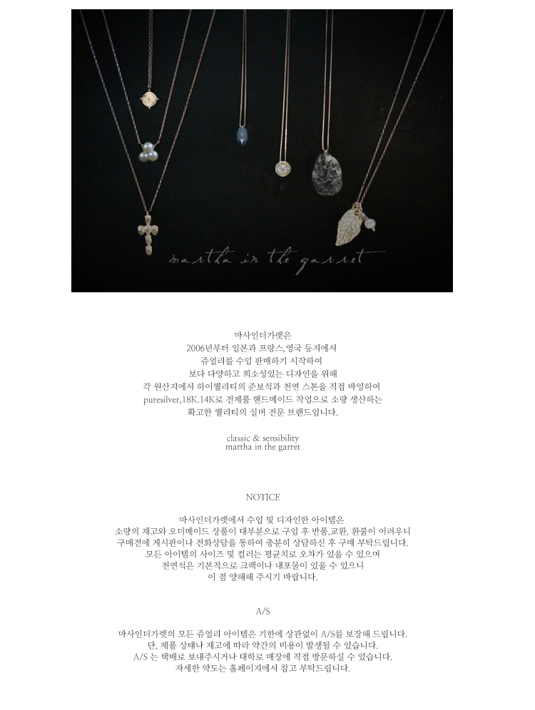 | - 앤틱한 무드의 마카사이트 셋팅이 돋보이는 크로스 모티브의 목걸이입니다. - 볼드한무게감과 체인의길이감에서 오는 시크함이 목선을 더욱 아름답게 빛내줍니다. - 순은 특유의 멋스런 텍스쳐와 컬러감이 더욱 빛을 발하는 아이템입니다. - 기존 마사의 체인보다 더욱 볼드하여 쉽게 끊어지지 않으며 더욱 시크합니다. - 글리터링한 커팅으로 빛의 각도에따라 반짝임을 더합니다. - 화려하고 요란한 느낌보다는 은은한 고급스러움을 선사하는 쥬얼리입니다. ※ 마사인더가렛"의 모든 쥬얼리는 최고급 수입원석을 소재로 타사이트에 유통되지 않으며 100% 은 소재로서 알러지 염려가 없습니다. |