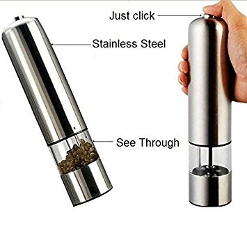 iRSE Electric Stainless Steel Salt and Pepper Grinder - Brushed Stainless Steel Pepper Mill and Salt Mill, plastic see through Tall Body, Grade Adjustable Ceramic Rotor- Salt & Pepper Shaker (Silver)
