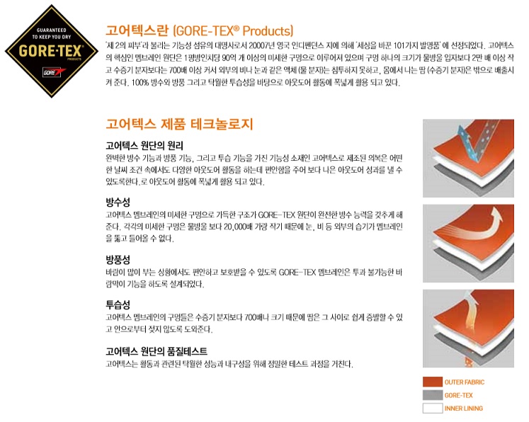 우수한 방수,투습성의 GORE-TEX 2LAYER 자켓,입체패턴적용하여 각부의에 움직임을 저해하지 않고 자연스럽게 몸에 밀착.