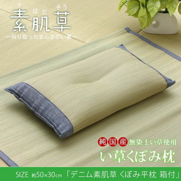 【商品名】枕 まくら い草枕 消臭 ピロー 国産 無地 『デニム素肌草 平枕 箱付』 約50×30cm 中材:い草チップ