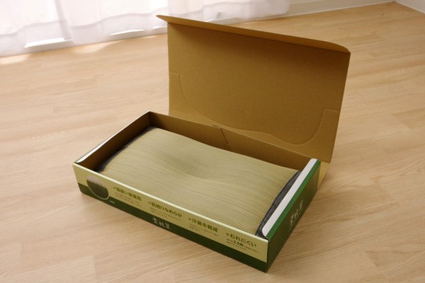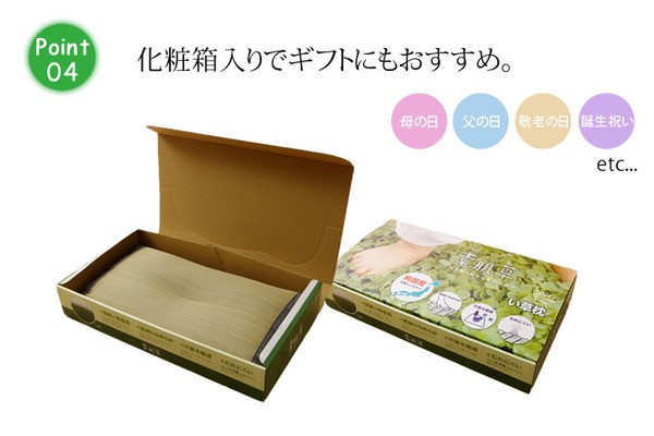 通常イ草商品で行われる「泥染め」という工程を抜き、イ草本来のすべすべとした質感にこだわったイ草枕です。長時間、肌に接する寝具だからこそ、自然素材を使い柔らかな質感にこだわりました。快眠い草の効能として1.綿の約2.5倍の吸湿力 2.蒸れにくい。汗による湿気を吸うことにより温度を下げ快適な就寝を促します。 3.汗のにおいを軽減。汗のにおいの元となる化学物質を90%以上抑えます。などがあります。国産(九州産)のしなやかなイ草を使用していますので、柔らかく、すべすべしたとした肌触りです。本商品はさらに、い草にプレス加工を行うことで、通常のイ草枕に比べ凹凸を無くしております。肌、お顔に寝痕がつきにくい仕様に仕上げました。『イ草の枕で寝るのは気持ちいいけど顔にイ草の痕がつくのが嫌だな』という方におススメの商品です。お仕事のちょっとした休憩時間の仮眠にも最適です。中材はイ草チップ100%です。よりイ草の良さを実感して頂ける商品です。化粧箱入りでお届けしますので、贈り物にもぴったりです。※箱のデザインはイメージです。予告なくデザインが変更になる場合があります。ご了承下さい。