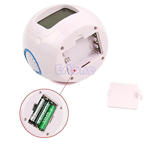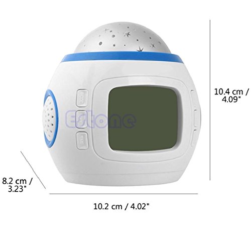 Studio : Yeahii Publisher : Yeahii Binding : Kitchen Product Description 100% brand new and high quality 100% brand new and high quality Display Time, Day, Date, Month, Year and Temperature Thermometer: shift between Centigrade temperature and Fahrenheit temperature (0°C-50°C, 32°F-122°F). Thermometer: 12/24 hour conversion Chord music / nature sound alarm Snooze function Countdown function (timing from 00: 00: 00-23: 59: 59 hours) Music mode (10 music selection) Backlight function Dynamic projection of colored starry sky accompanied with music rhythms Low power consumption, environmental friendly A great gift for your family Specification: Material: Plastic Color: White Blue Time Format: 12-hour or 24-hour Display Type: Time, Date, Mouth, Day, Temperature Thermometer Types: Centigrade Temperature or Fahrenheit Temperature Powered By: 3 x AAA Batteries (not included) (not included) Size: 10.4*10.2*8.2 cm/ 4.09"*4.02"*3.23" (approx.) Quantity:1 Pc Note: Size for manual measurement, there may be a 0 to 1 cm error, belongs to the normal phenomenon. Due to the difference between different monitors, the picture may not reflect the actual color of the item. Thank you! 0