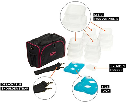 Meal Prep Bag by LISH - Complete 15 Piece Insulated Meal Management Set (Black & Red)