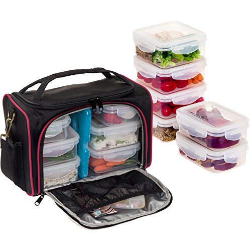 PRODUCT SPECIFICATIONS - Set includes 1 insulated lunch bag (Measures 11.5" x 8" x 7"), 12 snap lock food containers - 8 square (Measures 5" x 5" x 2") and 4 rectangle (Measures 5.75" x 4.25" x 1.6"), and 1 vitamin organizer (Measures 2.75" x 3.5" x 0.75"). Removable strap adjustable up to 26" strap drop.