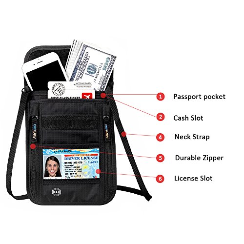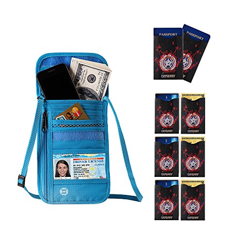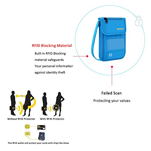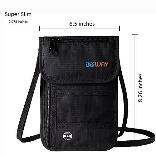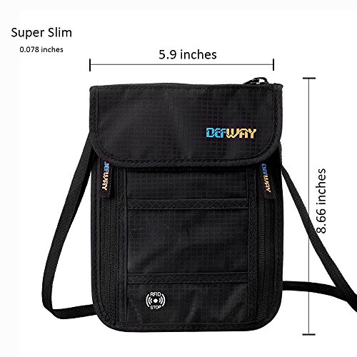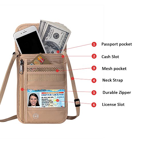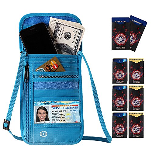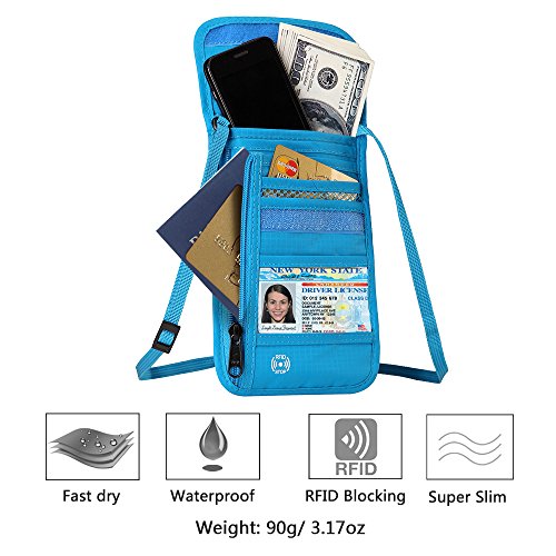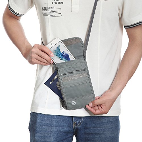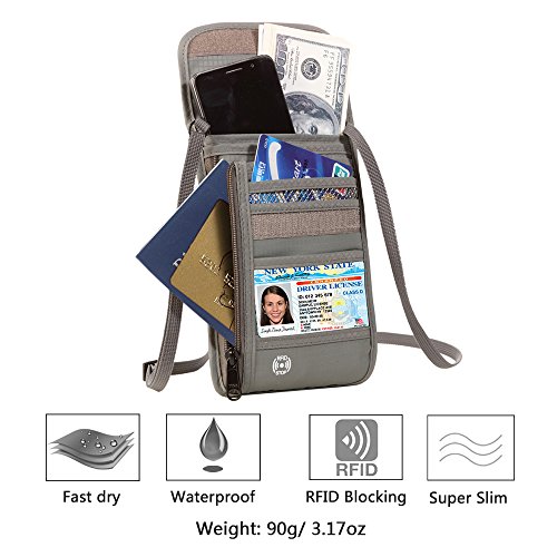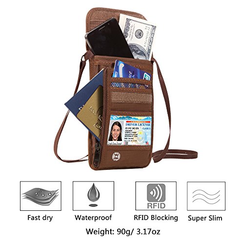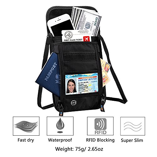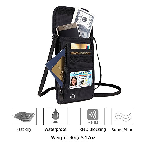 RFID Wallet RFID Blocking Neck Wallet is made from high quality waterproof nylon, offer a better grip on the clutch. Well organized your carry-on essentials, such as credit cards, identify cards, coupons, tickets, key, money, coins, cash and etc. Keep them all in the wallet and protect them well anywhere you go. Durable and lightweight, you can hold it or put it into the wallets to carry with you.
